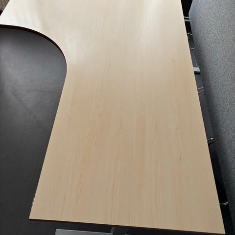 Stabilt och praktiskt L-format skrivbord från Edsbyn. Använts i kontorsmiljö och gungar inte vid höjning/sänkning. Ingår papperskorg och förvaringskorg som är lätt att demontera om man vill det.