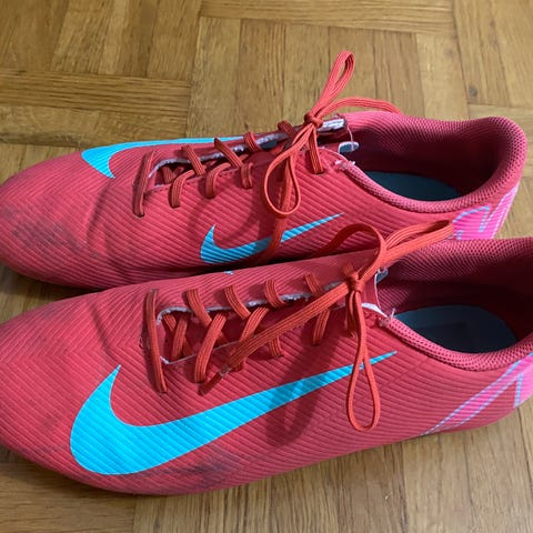 Nike fotbollsskor strl. 44 . Medföljer ett par svarta och grå benskydd med remmar för fastsättning. Skorna är avsedda för fotboll och har en design som kombinerar funktion och komfort.
