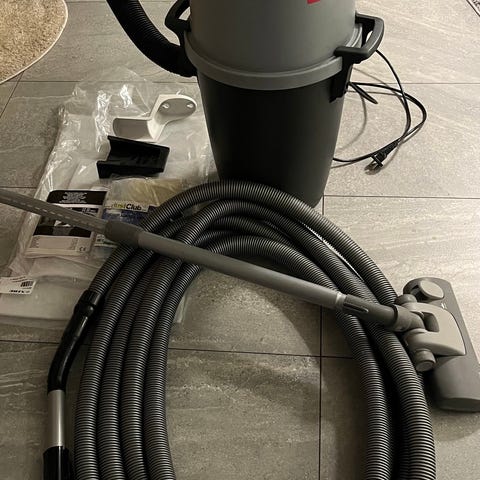 Nilfisk GS90 vintage dammsugare med tillhörande slang och munstycken. Produkten är avsedd för hushållsbruk och har en robust design.