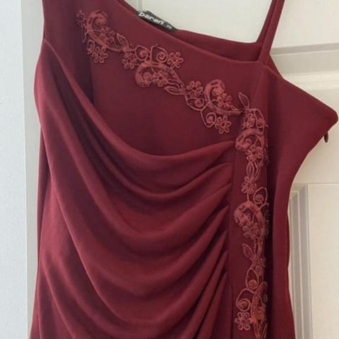 Långklänning från Nelly Eve i storlek XS, brun/vinröd färg. Klänningen är sparsamt använd och har en passform som framhäver figuren superfint. Den är gjord av polyester, elastan och spets!