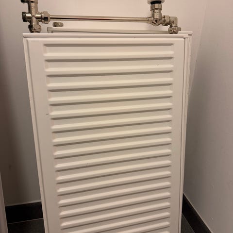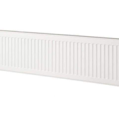 Ej specificerat panelradiator i vit färg. Radiatorn är av standardstorlek och design, lämplig för uppvärmning av rum.