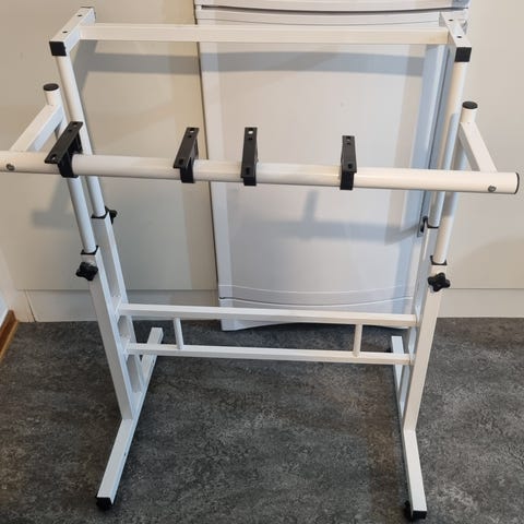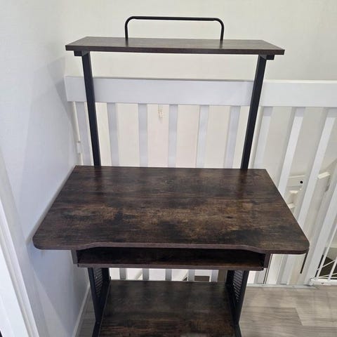 Ett mindre datorbord/skrivbord med hjul som passar bra till mindre utrymmen. Praktisk utdragbar hylla att placera t ex tangentbord och mus på. Kan höjas och sänkas manuellt.
