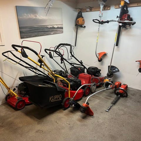 Parti med trädgårdsmaskiner och redskap bestående av: