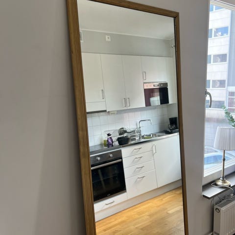 Spegeln har en höjd på 255 cm och en bredd 75 cm.