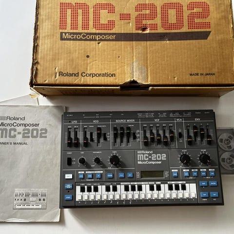 Nu har vi fått in en urfin Roland MC-202 analogsynt från 1983 i orginalkartong. MC-202 är i stort en Roland SH-101 med lite större sequenser.