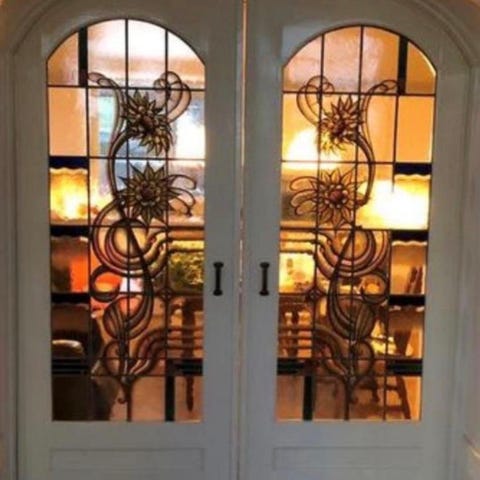 Gamla skjutdörrar med blyglasfönster.