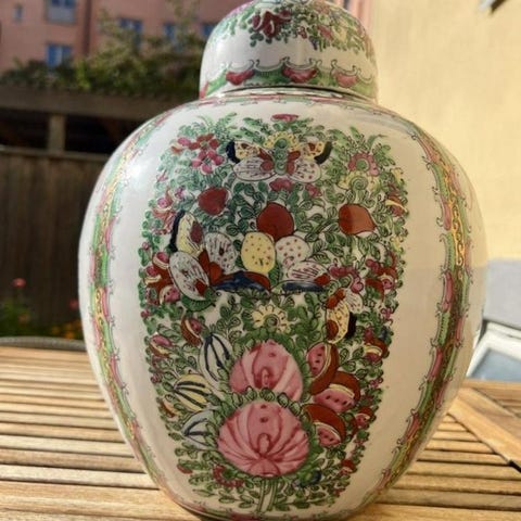 Qingdynastin Kinesisk porslinsurna med detaljerat blommönster i flera färger.