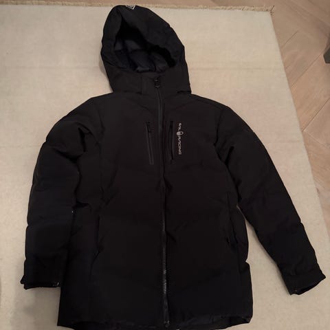 Tunnare dunjacka från Sail Racing i storlek 140. Fint skick. Enda anmärkningen är några mindre fläckar på luvan som jag inte försökt få bort (se bild).