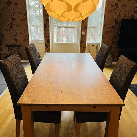 Jättefint matbord med 5 stolar säljes då det tyvärr inte får plats i vår nya lägenhet. Vi har ägt bordet i 4 år och älskat det! Det har alltid varit en duk på så bordet är helt fritt från skrapmärken eller liknande.