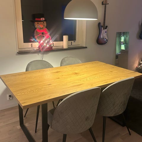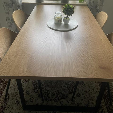 • Stilrent matbord i varm ek-look med svarta stålben – passar både kök och matrum.
