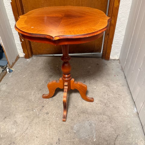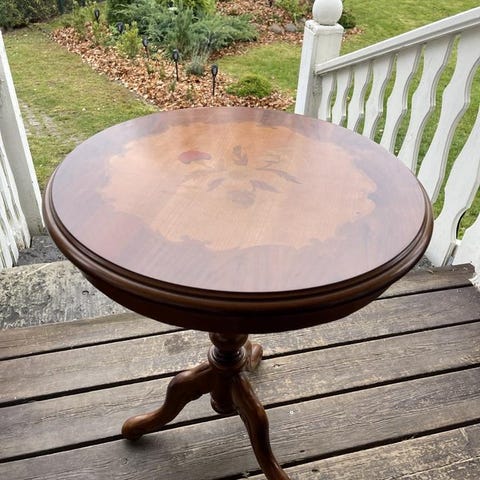 Vackert antikt pelarbord 1800/1900-tal. Bordsskivan är i trä med naturlig finish och har en oregelbunden form, mörkgröna dekorativa ben. Passar som sidobord eller avlastningsbord i olika rum.