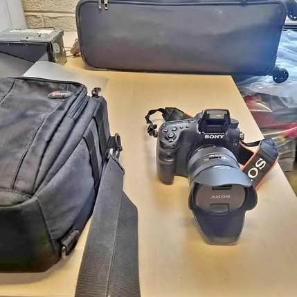 Sony Alpha spegelreflexkamera med utbytbar objektivfattning. Kameran är svart och har en ergonomisk design med flera kontrollknappar och en LCD-skärm på baksidan. Medföljer är kamerahus, kamerarem och tillbehör såsom laddare och kablar.