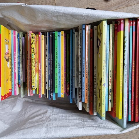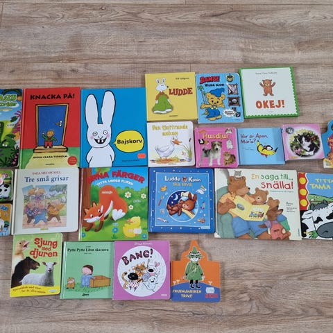 Baket med 27 barnböcker för små barn med olika titlar och författare. Böckerna varierar i skick, vissa är som nya och vissa mer använda.