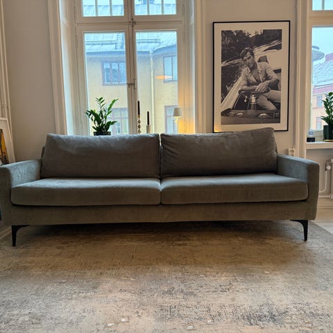 Soffan är använd men i fint skick, utan några större synliga fläckar. Bekväm och modern soffa med mjuka, rundade former och låg lounge-känsla.