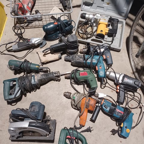 Borr- och mejselsats med olika storlekar på borr och mejslar i plastfodral. Verktygen är avsedda för borrning och mejsling. Detta är bortsatts för betong. Några borrar lite mer slitna än andra.