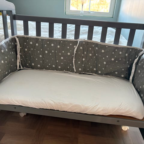 Grått spjälskydd till bedside crib från NG Baby. En längre och en kortare del för att passa den avtagbara sidan. Fint skick.