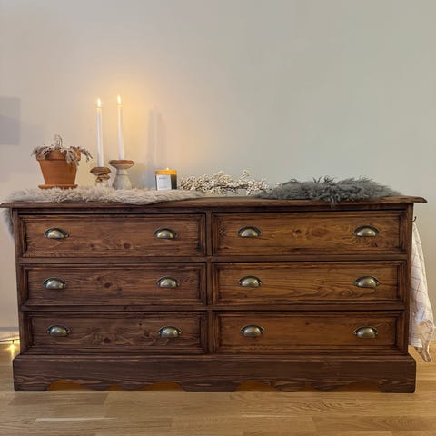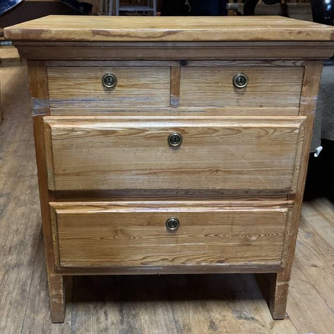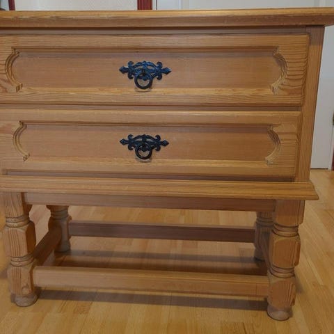 Såpad toppskiva i furu, underrede målat med snickerifärg. Beslag i mässing.
