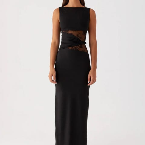 Party-/cocktailklänning i svart färg, storlek 36/38. Klänningen har ärmlös design och är försedd med guldfärgade detaljer samt dragkedja framtill. Passar för formella och festliga tillfällen.