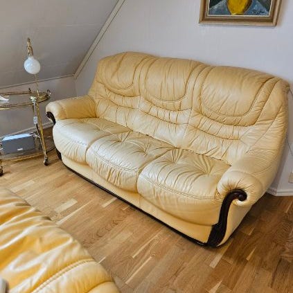 Inkluderar 3 sits + 4 sits där ett par rivmärken syns på 4sitsen trots att ha haft överdrag sedan inköp. Annars är tyget och soffan stilren med superkomfort.