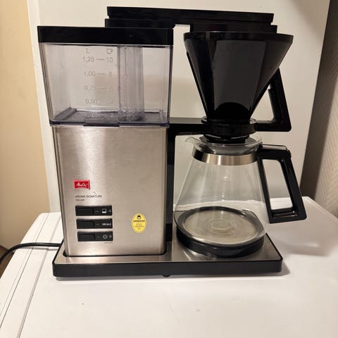 Melitta kaffebryggare i svart färg med glasbehållare och handtag. Utrustad med strömkabel och lock. Passar för bryggning av kaffe i hushåll.
