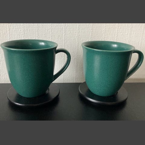 2 gröna keramik muggar, Höganäs, kartong, strl Jumbo, svarta trälock, Collection Hellgren.