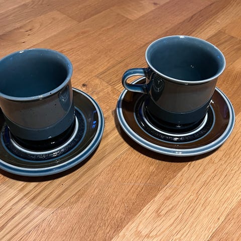 2 nya gröna keramik muggar, Höganäs, i kartong, höjd 9,5 cm, omkrets 9 cm, svarta trälock, Collection Hellgren.