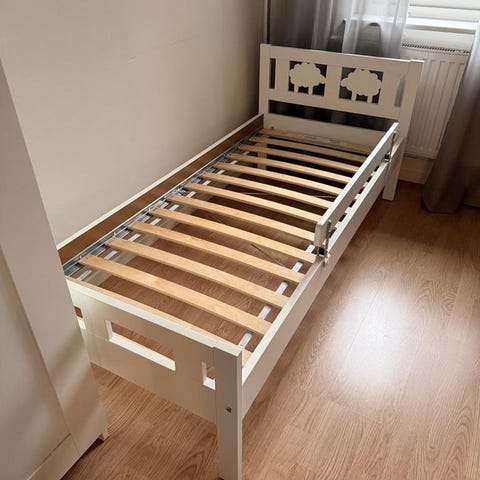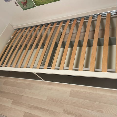 IKEA barnsäng i vitt med integrerade förvaringslådor under sängen. Sängen har en ram av trä och är perfekt för barnrum eller gästrum.