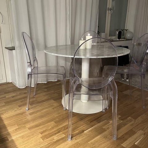 Stilrent och gediget bord i äkta marmor med tidlös design. Bordsskivan har vissa vattenfläckar, vilket är normalt för marmor och syns bara i viss solljus. Det finns även en spricka på ena kanten av bordet. I övrigt är bordet i bra skick och mycket stabilt.
