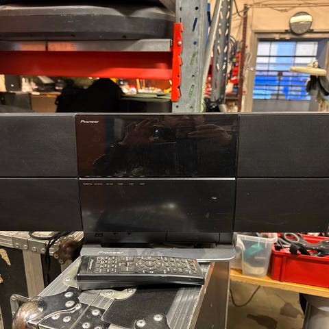 Pioneer förstärkare med högtalarsystem i svart färg. Systemet inkluderar flera högtalare och en förstärkare. Passar för ljuduppspelning i hemmiljö.