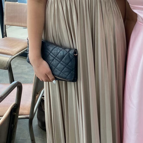 Klänningen är uppsydd efter min längd som är 165 cm plus 10 cm klackar, med ett litet släp baktill. Finns även en slit på klänningen för ett fint flow.