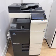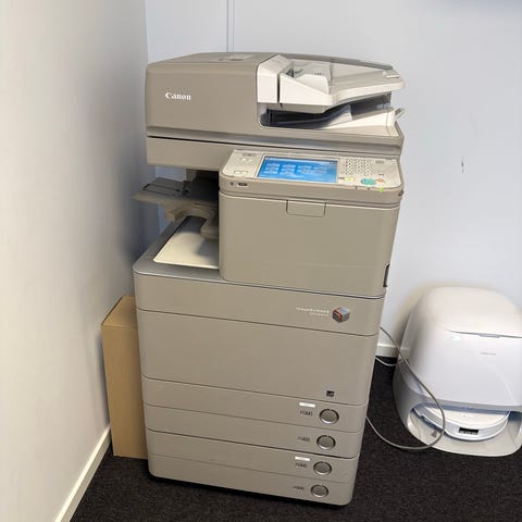 Sharp MX-5112N multifunktionsskrivare med färgskärm och tangentbord. Utrustad för kopiering, utskrift, skanning och fax. Har flera pappersfack och stödjer nätverksanslutning. Funkar bra, fastnar aldrig papper och har toner, men lämnar en del fula streck på utskrifterna (inte alltid, men oftast - se sista bilden).