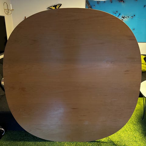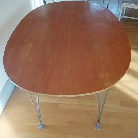 Copy of Fritz Hansen's bord designat av Bruno Mathsson. Bordet har en oval form och är tillverkat i trä med metallben. Passar för användning i matsal eller vardagsrum.