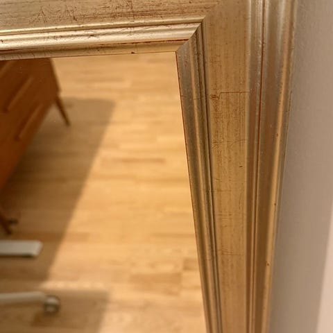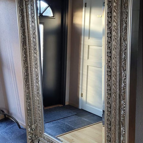Här har du chansen att köpa en spegel som både är stilren och modern i sitt snitt med en silverfärgad träram. Spegeln är i nyskick och har inga skavanker eller skador.