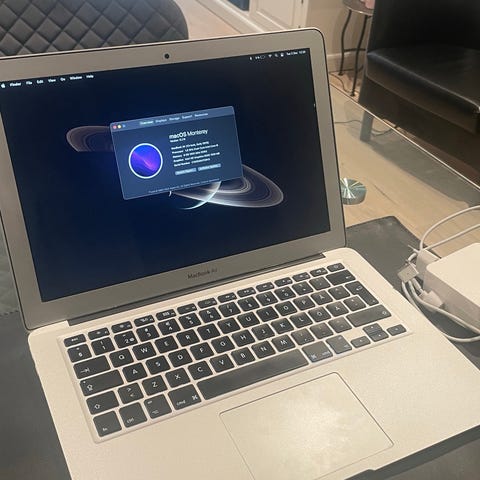 Apple MacBook Air 13 tum 2017 laptop med Intel Core i5-processor, 8 GB RAM och 1600 MHz DDR3-minne. Utrustad med Intel HD Graphics 6000 med 1536 MB grafikminne. Operativsystem macOS Monterey version 12.7.4. 256 GB Batterikapacitet 7841 mAh med full laddning och 130 laddningscykler. Färg silver.