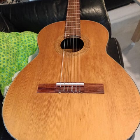 Säljer en Ritmo T2 som spelar och låter fint. Den är tillverkad i Spanien och enligt förra ägaren från mitten av 70-talet, men har inte kunnat verifiera detta själv. En liten del av halsen saknar lite färg, men inget som känns eller påverkar spelbarheten.