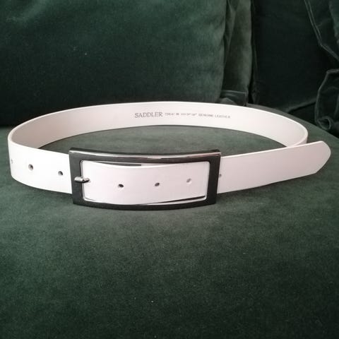 Svart läder skärp m silverspänne, bredd 3 cm, längd 75 cm, yttersta 87 cm.