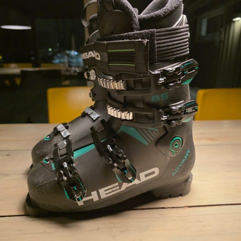 Head Raptor skidpjäxor i svart färg. Pjäxorna har fyra spännen och kardborreband för justerbar passform. Använda med synliga tecken på användning men i funktionsdugligt skick. Passar för skidåkning. Storlek 25.0-25,5cm