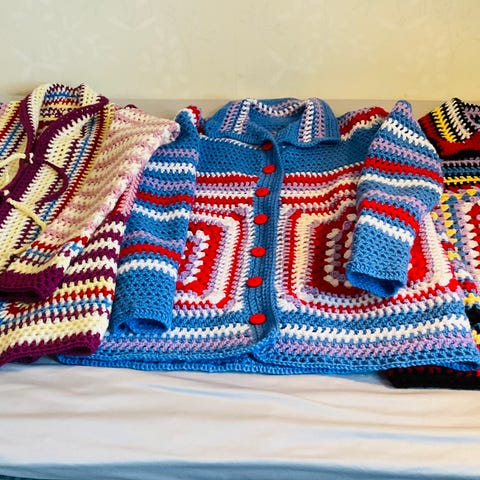 Pris per tröja 950:-. Kom gärna och se dem och ev prova. (Det finns fler tröjor än dessa också nya och handvirkade,