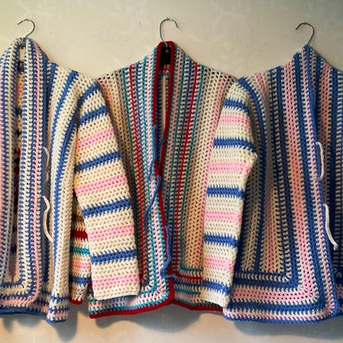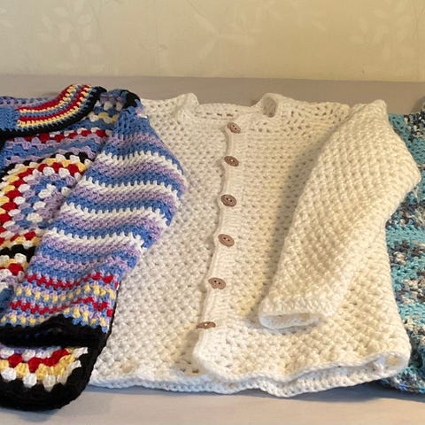 3 helt nya handvirkade tröjor. Kan passa på både dam/herre. Storlekar mellan 38-42 ca. Virkade med garn i akryl och utan mönster m a o dessa tröjor finns endast i dessa exemplar.