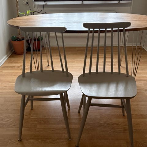 Säker 3 fina bemålade pinnstolar i ljusblå färg. Stolarna är stabila och utan sprickor i spjälorna men har visst färgsläpp.