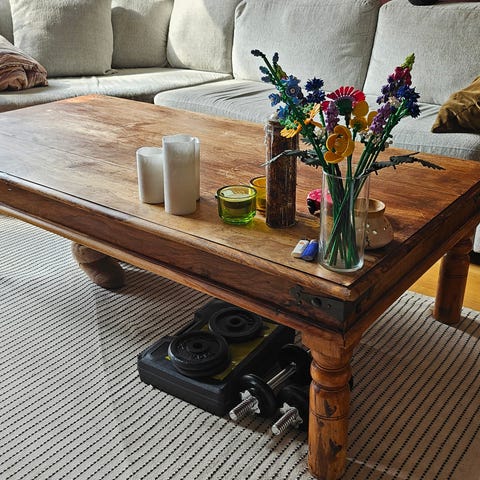 Vackert slitet soffbord i trä. Köpt på auktion.
