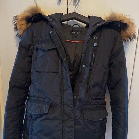 Varsamt använd Hollies vinterjacka av dun i storlek 34 som håller värmen ordentligt. Pälsen är äkta.