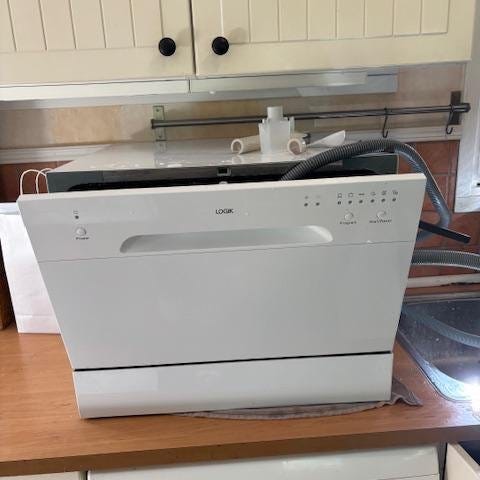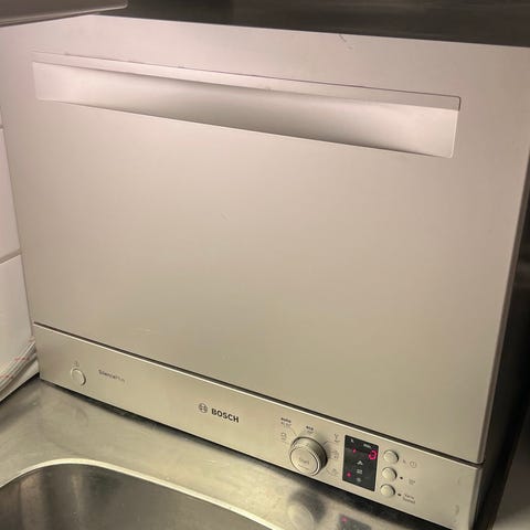 Electrolux bänkdiskmaskin med digital display och justerbara korgar för bestick och tallrikar. Vit färg och standardstorlek för köksinstallation. Passar för hushållsbruk.