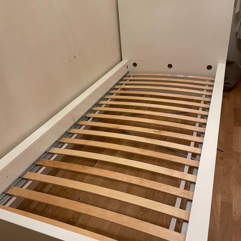 Sängramen är i gott skick. En av spjälorna har en spricka i sig som jag lagat med silvertejp, det är dock inget som påverkar funktionen.
