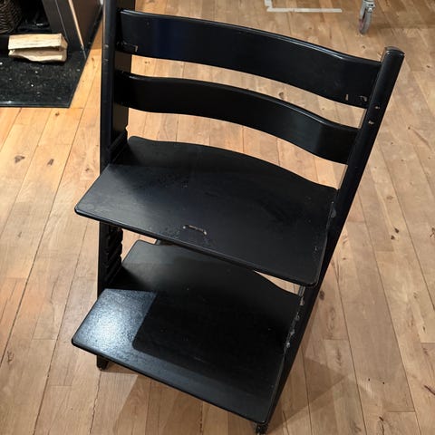 Stokke Tripp Trapp barnstol i vit färg. Justerbar stol designad för barn med möjlighet att anpassa sits och fotstöd efter barnets storlek och ålder. Tillverkad i trä och avsedd att användas som barnmöbel.
