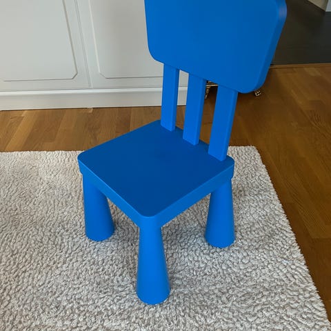 Barnstol med bricka blåmes inköpt på Ikea.