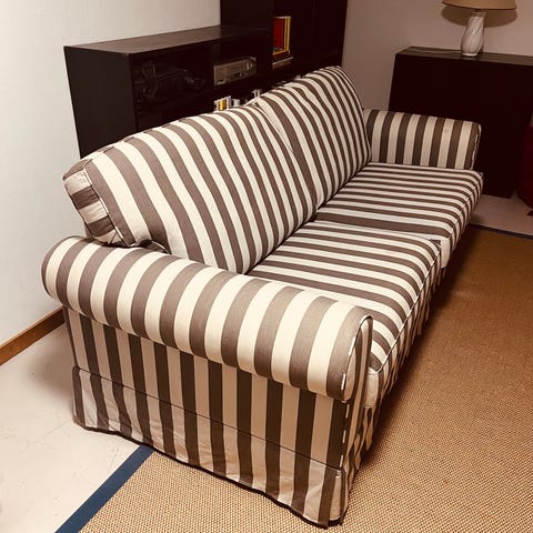 Grå tygsoffa med plats för två personer. Soffan har stoppade armstöd och ryggstöd för komfort. Passar i vardagsrum eller liknande utrymmen.