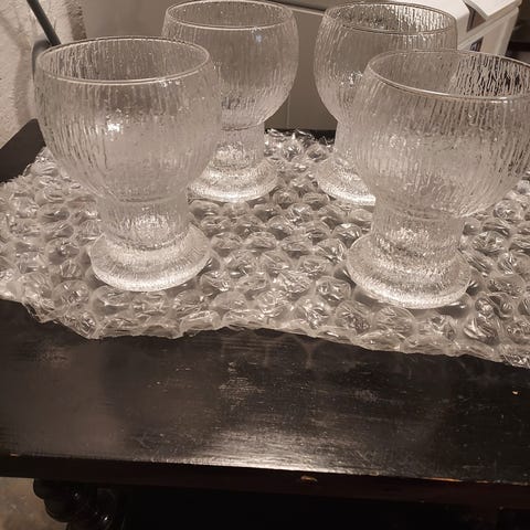 Carlsberg ölglas med guldkant, 4-pack. Glasen är av klart glas med Carlsberg-logotyp i grönt och rött. Varje glas har en fot och är utformade för servering av öl. på ett av glasen har guldkanten nötts bort hela och i bra skick.