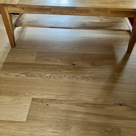 Soffbord i massiv ek med svart granitskiva i mitten.