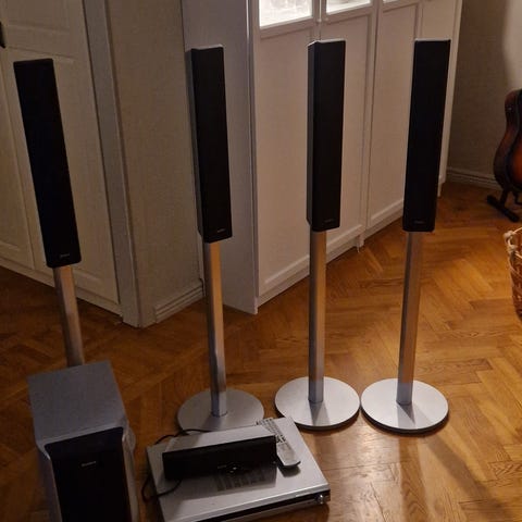 Sony hemmabiosystem med receiver och flera högtalare i träfinish. Systemet inkluderar en subwoofer, front- och surroundhögtalare. Anslutningar och kontroller finns på receiver-enheten. Passar för att förbättra ljudupplevelsen i hemmabiomiljö. Märke på högtalare Proson.